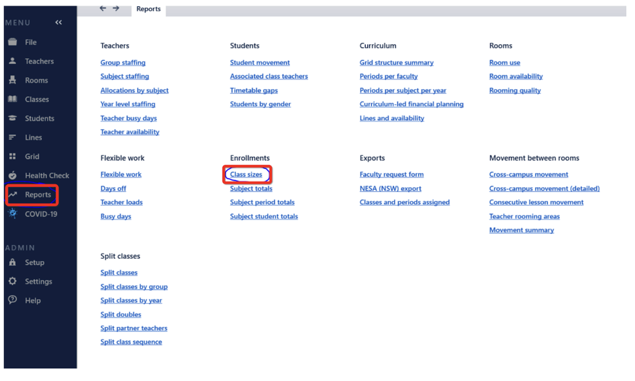 - Click Reports -> Within Enrollments (Class Sizes) - see below