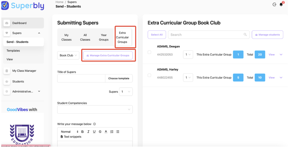 Extracurricular groups can be created in Superbly. Examples may include School Clubs, Sports Teams, Special Events (carnivals) etc.